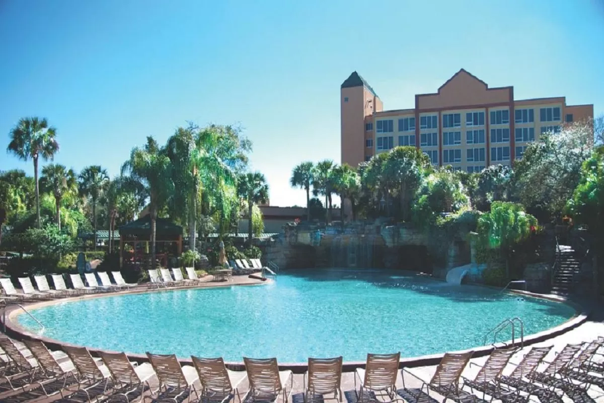 Nestled on 15 acres of tropical landscape, this hotel features free transfer service to Walt Disney World. Guests can start their day with a complimentary breakfast and then take a dip in one of 3 heated pools. Complimentary WiFi is provided for all guests.. Walt Disney World is an 8 minutes' drive from the property. Rooms feature a flat-screen TV with cable channels. A refrigerator, coffee maker, and microwave are provided as well. Select rooms provide and additional seating area with sofa bed. Guests enjoy an outdoor meal with barbecue and picnic areas. A sports complex with basketball, tennis, sand volleyball courts and baseball fields is provided onsite. Guests will enjoy the 5-acre nature park with picnic areas and barbecue grills.